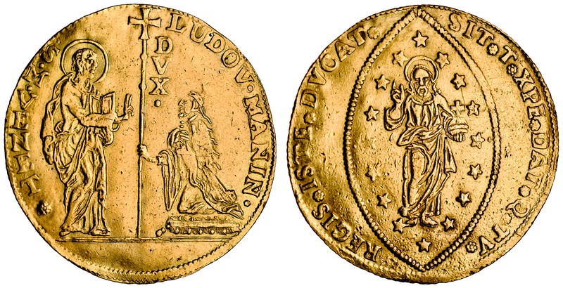 Italy, Venice, Ludovico Manin (1789-97), multiplo da 10-Zecchini, 34.39g, ludov. manin. s.m.venet., St Mark blessing Doge, who kneels before him and holds banner, rev. sit. t. xpe. dat. q. tv. regis. iste. dvcat., Christ in mandorla, sixteen stars around (CNI.62; F.1439; P.8), removed from a mount, very fine