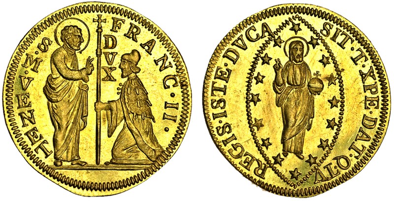(x) Italy, Lombardy-Venetia, Francesco II (Franz II 1798-1805), Zecchino, 3.49g, new type, franc. ii. s. m. venet, St Mark blessing Doge, who kneels before him and holds banner, rev. sit. t. xpe. dat. q. tv. regis. iste. dvca, Christ in mandorla, sixteen stars around (CNI.411; F.1516a; Mont.5; Pag.4; P.921 - R3), some hairlines on the reverse but brilliant uncirculated, very rare