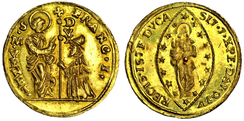 (x) Italy, Lombardy-Venetia, Francesco (Franz I 1815-35), Zecchino, 3.51g, franc. i. s. m. venet, St Mark blessing Doge, who kneels before him and holds standard, rev. sit. t. xpe. dat. q. tv. regnis. iste dvca, Christ in mandorla, sixteen sates around (CNI.38; F.1517; P.972 - R3), small extra piece of metal in centre of reverse, extremely fine, very rare