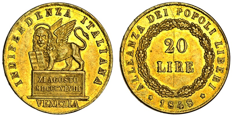 (g) Italy, Venice, Provisional Government, 20-Lire, 6.44g, 1848, Lion of St Mark on pedestal, rev. value in wreath (CNI.1; F.1518; Mont.89; Pag.176; P.1106 - R2), extremely fine, rare