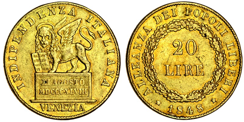 (g) Italy, Venice, Provisional Government, 20-Lire, 6.36g, 1848, Lion of St Mark on pedestal, rev. value in wreath (CNI.1; F.1518; P.1106 - R2), very fine, rare