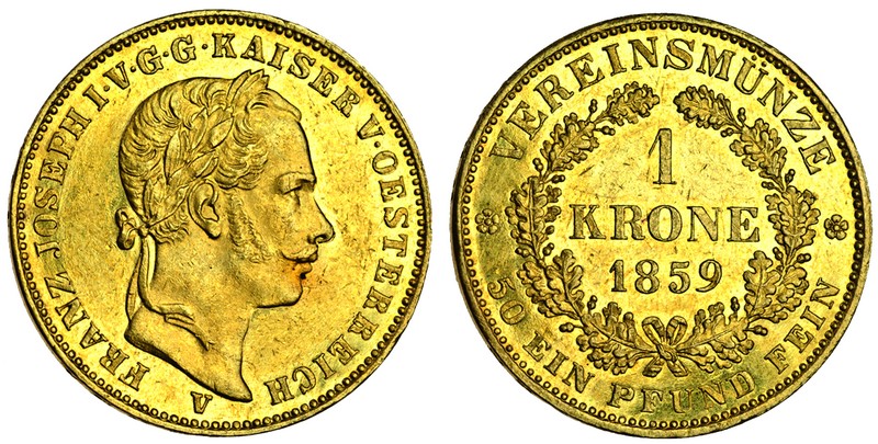 (x) Italy, Lombardy-Venetia, Francesco Giuseppe (Franz Joseph 1848-66), Venice, Corona or Krone, 11.12g, 1859, laureate head right, V below, rev. value and date in wreath (CNI.29; F.1514; Mont.256-R3; Pag.195; P.1139 - R3), about extremely fine, very rare