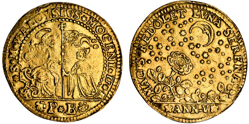 Italy, Venice, Alvise II Mocenigo (1700-09), Osella, anno V, struck in gold 'da 4 Zecchini', 14.14g, *s.m.v. aloysivs* moceni* d*, St Mark seated, handing standard to Doge who kneels before him, *p*b*, for Pietro Basadonna, in exergue, rev. magis redolet lvna serena, rose, moon and stars, *ann*v* in exergue (P.356), very fine