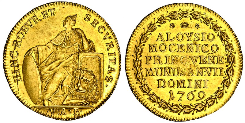 (x) Italy, Venice, Alvise IV Mocenigo (1763-78), Osella, anno VII, 1769, struck in gold 'da 4 Zecchini' 13.95g, hinc. robvr.et secvritas., Venetia seated holding a shield, the Lion at her side, .v:a:b., for Vincenzo Antonio Bragadino, in exergue, rev. aloysio mocenigo pronc: vene: munus an: vii. domini 1769 in wreath (CNI.204; P.463), extremely fine