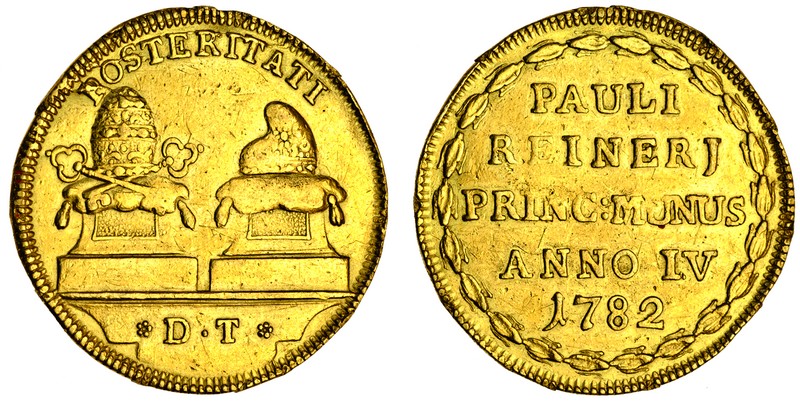 (x) Italy, Venice, Paolo Ranier (1779-89), Osella, anno IV, 1782, struck in gold 'da 4 Zecchini', 13.84g, posteritati, Papal Tiara and Corno Dogale on socles, *d*t* for Domenico Trevisan, below, rev. pauli rainieri princ: munus anno IV 1782 in wreath (CNI.-; P.485), removed from a mount, very fine