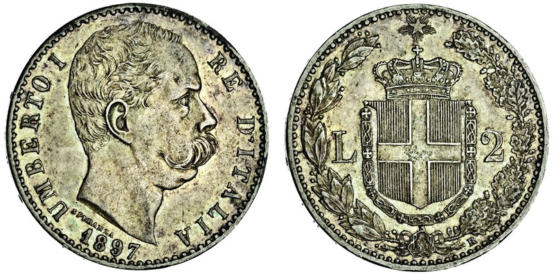 Italy, Kingdom, Umberto I (1878-1900), 2-Lire, 1897 R, head right, rev. crowned shield dividing value in wreath (KM.23; Mont.43; Pag.598), extremely fine, old gold toning
