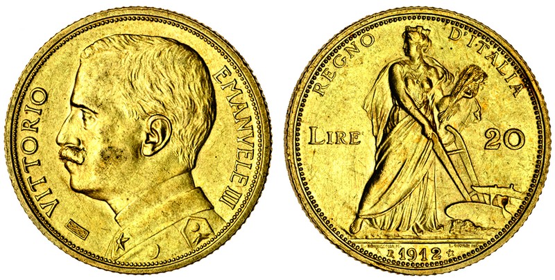 (g) Italy, Kingdom, Vittorio Emanuele III (1900-46), 20-Lire, 1912, uniformed bust left, rev. Roma 'aratrice', female figure with plough (F.28; KM.48; Pag.667), very fine