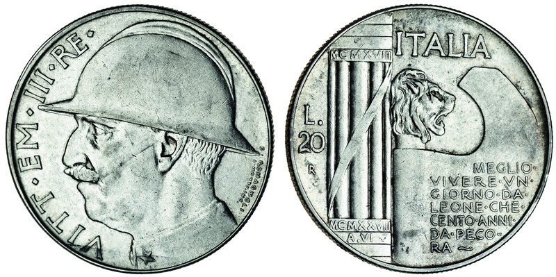 (g) Italy, Kingdom, Vittorio Emanuele III (1900-46), 20-Lire, 1928, on the 10th Anniversary of the Great War, helmeted head left, rev. fasces and lion head (KM.70; Gig.10; Pag.680), extremely fine