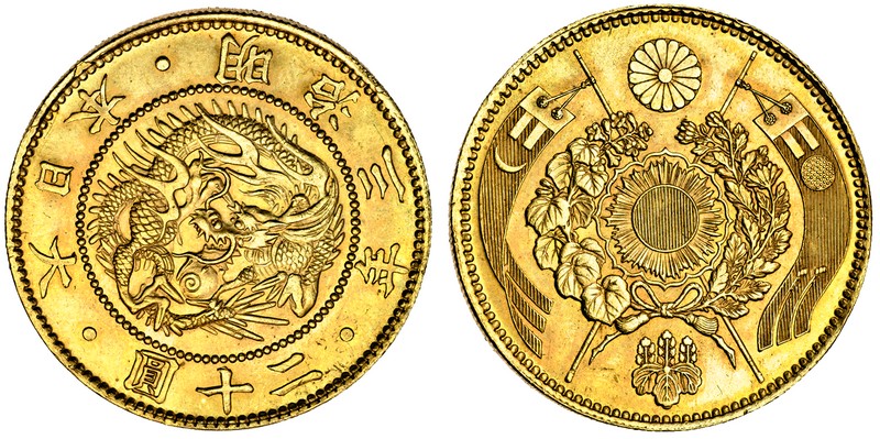 (x) Japan, Mutsuhito (1867-1912), 20-Yen, Meiji year 3, dragon, rev. wreath and banners around sun, chrysanthemum above, pawlonia leaf below (F.45; JV.L1; KM.Y13), several marks on edge, otherwise about extremely fine, rare