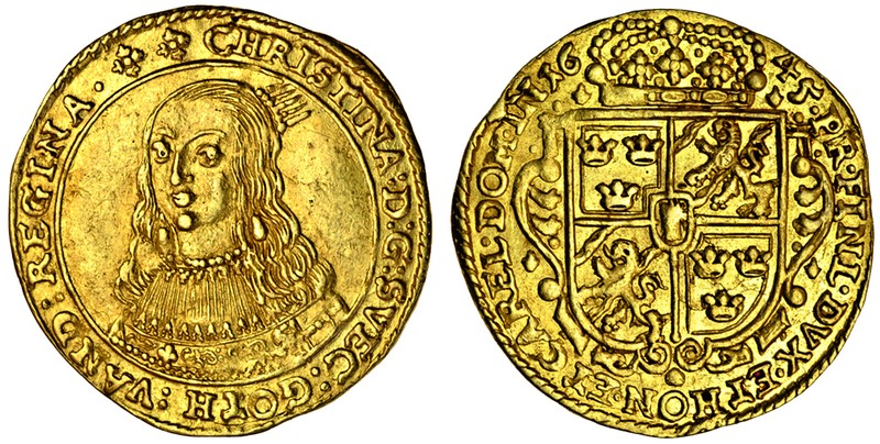 Lithuania, Riga, Kristina of Sweden (1632-54), Ducat, 3.49g, 1645, bust three-quarters left, rev. crowned shield (AAH.37 as Erfurt; F.929 as Erfurt), nearly extremely fine