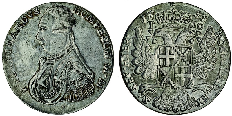 Malta, Ferdinand Hompesch (1797-99), 30-Tari, 1798, uniformed bust left, dot below (struck during the French occupation), rev. arms (Dav.1611; KM.345.3), very fine