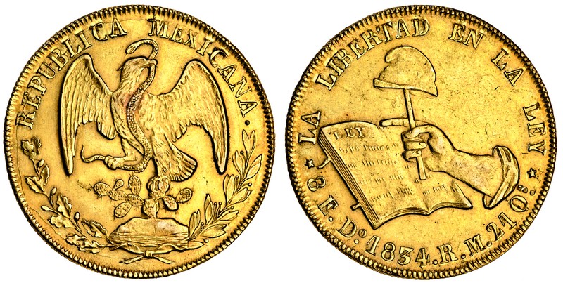 (x) Mexico, Republic, Durango, 8-Escudos, 1834 RM, eagle, rev. cap over book (F.68; KM.383.3), about extremely fine
