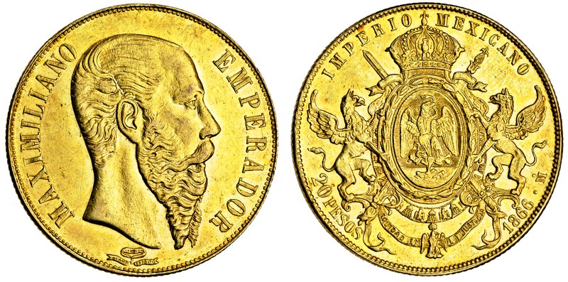 (g) Mexico, Maximilian (1864-67), Mexico city, 20-Pesos, 1866, head right, rev. arms (F.62; KM.389), very slight edge bruise at 11 o'clock, extremely fine