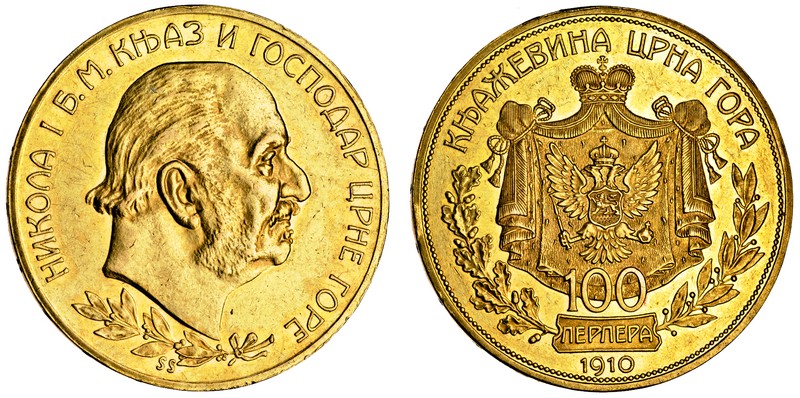 (x) Montenegro, Nicholas I (1860-1918), 100-Perpera, 1910, head right, rev. crowned arms in wreath (F.1; KM.12; Schl.1), one slight bump on edge, proof-like, about extremely fine