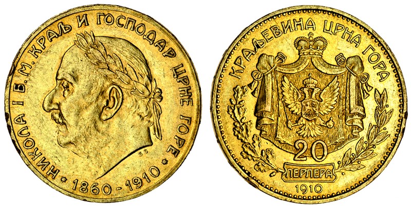 (x) Montenegro, Nicholas I (1860-1918), 20-Perpera, 1910, laureate head left, rev. crowned arms in wreath (F.5; KM.11; Schl.5), edge marks, very fine