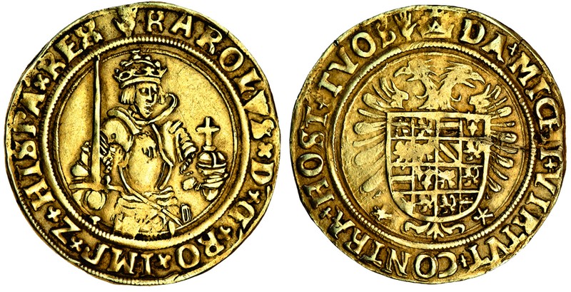 Netherlands, Brabant, Charles V (1506-55), Antwerp, Real d'or, Emperor half-length in armour, holding sword and orb, rev. shield (Del.97; F.56), scratch on reverse otherwise very fine