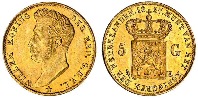 (g) Netherlands, William I (1815-40), Brussels, 5-Gulden, 1827, head left, star below, rev. crowned shield dividing date, palm branch and B below (F.330; KM.60; Sch.198), extremely fine