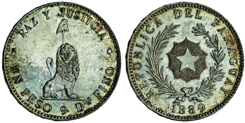 Paraguay, Peso, 1889, lion seated in front of liberty cap on pole, rev. star in wreath (Eliz.1; KM.5), brilliant uncirculated