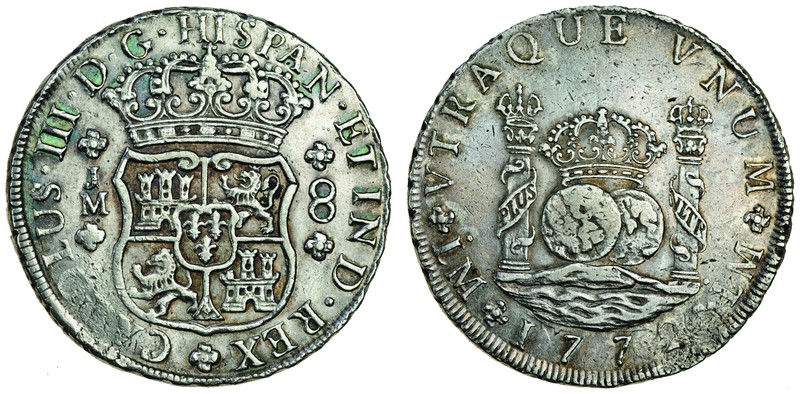 Peru, Charles III (1759-88), Lima, 8-Reales, 26.67g, 1772 JM, dots over both monograms (Cal.356; Cay.11996; KM.64.1), weak at edge between 7 and 8 o'clock on obverse and between 4 and 5 o'clock on reverse, cleaned, very fine, the last of the series