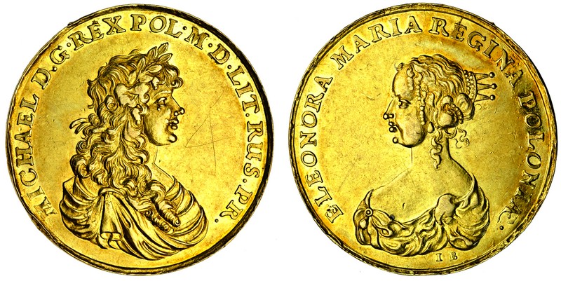(x) Poland, Michel Korybut (1669-73), Wedding to Eleonora Maria, gold medal of 4-Ducats, 13.76g, by Jan Buchheim, undated (1670), michael d.g. rex pol. m.d. lit. rus. pr, laureate and draped bust of prince Michael right, rev. eleonora maria regina poloniae, draped bust left, signed ib below (Forrer I, 306; HCz.2394), edge bruise at 7 o'clock, the value 4 very lightly scratched in obverse field otherwise extremely fine, very rare