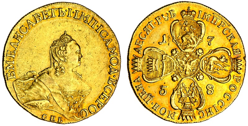 (x) Russia, Elizabeth (1741-62), St Petersburg, 10-Roubles, 1758, crowned and draped bust right, rev. four crowned shields cruciform, date in angles (Diakov 495-R3; F.122; KM.28.2; Sev.234), extremely fine, very rare thus