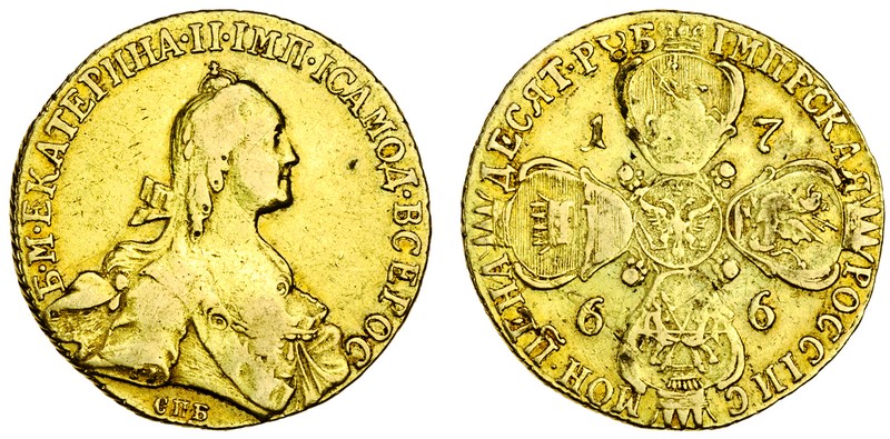 Russia, Catherine II the Great (1762-96), St Petersburg, 10-Roubles, 1766, bust right, rev. four crowned shields cruciform (F.129a; Sev.280), has been cleaned, edge smoothed in places, good fine
