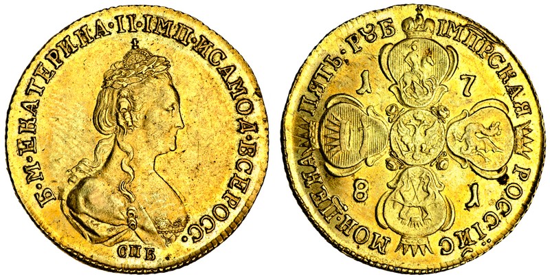 (x) Russia, Catherine II The Great (1762-96), St Petersburg, 5-Roubles, 1781, crowned and draped bust right, rev. four crowned shields cruciform, date in angles (F.130b; KM.78c; Sev.326), about extremely fine, rare thus