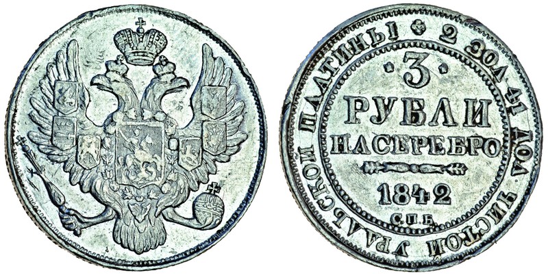 (x) Russia, Nicholas I (1825-55), platinum 3-Roubles, 1842, Imperial eagle, rev. value (KM.177; Sev.637), some scuffs but good very fine