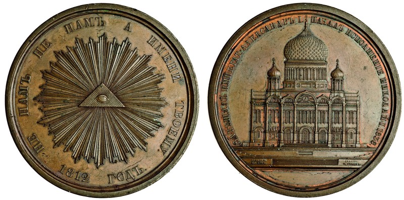 Russia, Nicholas I, Foundation of the Cathedral of Christ the Saviour, Moscow, 1838, bronze medal by P. Utkin, large radiant eye of providence, rev. view of the Cathedral, signed 'designed by K. Ton engraved by P. Utkin' below, 78mm. (Diakov 540; Smirnov 496), nearly extremely fine