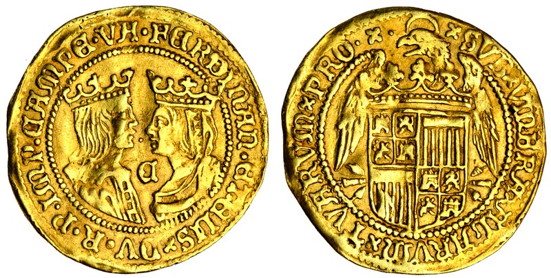 (x) Spain, Fernando V and Isabel (1476-1516), Cuenca, Double Excelentes, 6.91g, undated (c.1497), crowned busts vis-à-vis, mint letter C between, rev. crowned shield on eagle (Cayon 2912; F.132), slightly creased, very fine, scarce