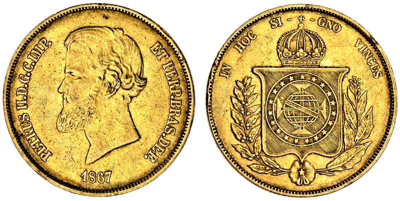 (g) Brazil, Pedro II (1831-89), 20,000-Reis, 1867, second head left, rev. crowned shield in wreath (F.121a; KM.468), very fine