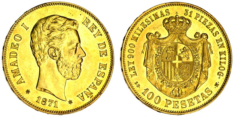 (x) Spain, Amadeo (1870-73), 100-Pesetas, 33.55g, 1871 SD-M, struck in yellow gold, bare head right, rev. crowned arms, lettered edge (Cayon 17455; F.340; KM.668a), hairlines, very light bruise on the rims at 11 o'clock and other marks on edge, otherwise extremely fine, extremely rare