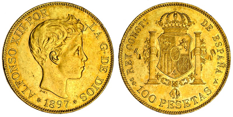 (x) Spain, Alfonso XIII (1886-1931), 100-Pesetas, 1897 SGV (18-97), boy head right, rev. crowned arms (Cay.17656; F.347; KM.708), a few tiny edge marks, nearly extremely fine