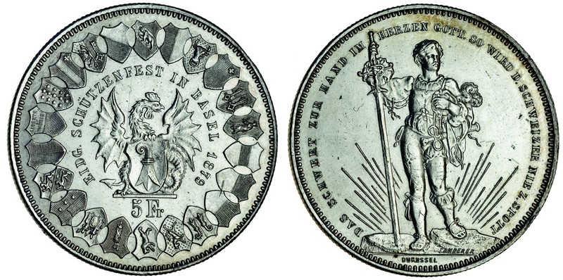 Switzerland, Basel, 5-Francs, 1879, for the Federal Shooting Festival, city arms in circle of shields, rev. soldier standing holding long sword (Dav.388; Divo S14; HMZ 2-1343i; Krause 31), cleaned, extremely fine