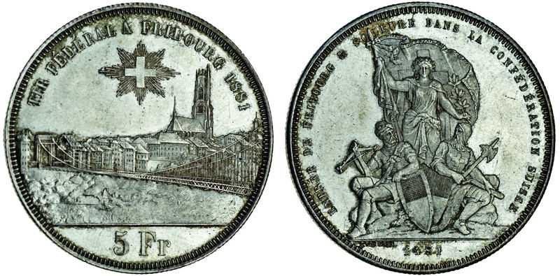 Switzerland, Freibourg, 5-Francs, 1881, for the Federal Shooting Festival, city view, rev. allegorical figures (Dav.389; Divo S15; HMZ 2-1343m; Krause 83), extremely fine