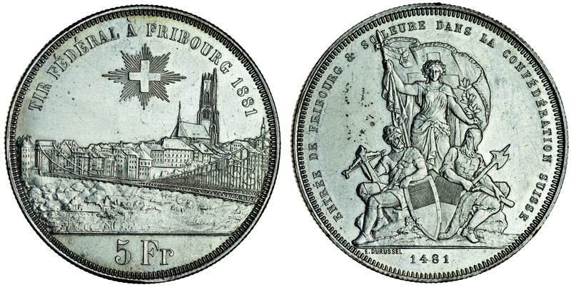 Switzerland, Freibourg, 5-Francs, 1881, for the Federal Shooting Festival, city view, rev. allegorical figures (Dav.389; Divo S15; HMZ 2-1343m; Krause 83), cleaned, extremely fine
