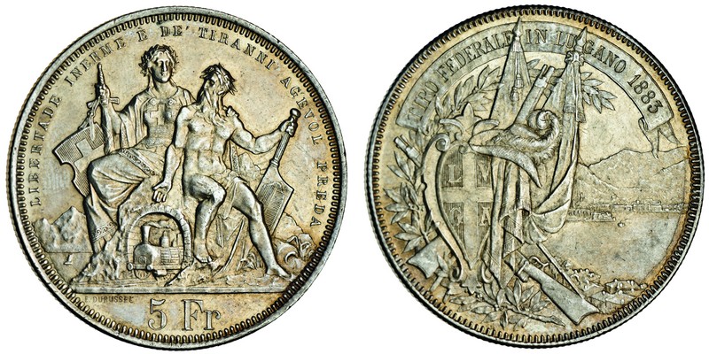 Switzerland, Ticino, 5-Francs, 1883, for the Federal Shooting Festival at Lugano, Helvetia and river god seated, rev. shield and trophy, Lugano in the distance (Dav.390; Divo S16; HMZ 2-1343n; Krause 236), about extremely fine