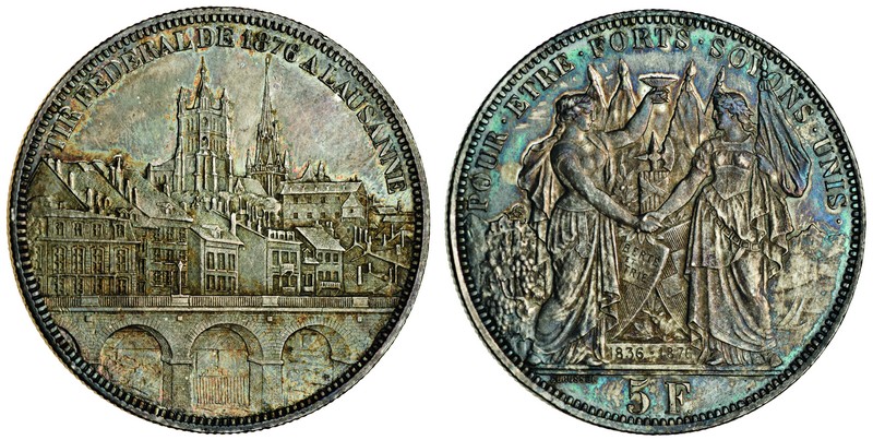 Switzerland, Vaud, 5-Francs, 1876, for the Federal Shooting Festival at Lausanne, city view, rev. allegorical figures of Helvetia and Vaud (Dav.387; Divo S13; HMZ 2-1343k; Krause 324), toned, extremely fine