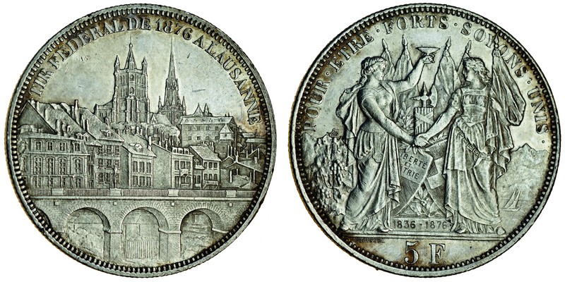 Switzerland, Vaud, 5-Francs, 1876, for the federal Shooting Festival at Lausanne, city view, rev. allegorical figures of Helvetia and Vaud (Dav.387; Divo S13; HMZ 2-1343k; Krause 324), about extremely fine