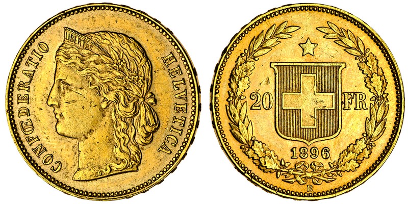 (g) Switzerland, Confederation, 20-Francs, 1896, laureate head left, rev. shield dividing value in wreath (F.495; KM.31.3), very fine