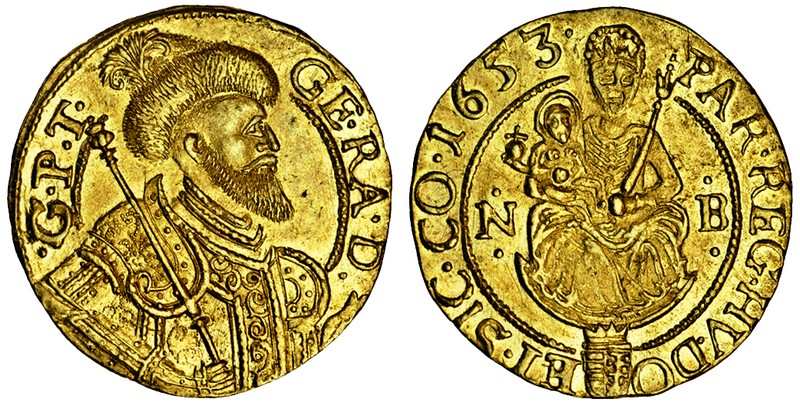 Transylvania, Georg II Rakoczi (1648-60), Nagybanya, Ducat, 3.51g, 1653, capped and cuirassed bust right, holding sceptre, rev. Madonna and Child, n-b in fields, shield below (F.399; H.538b), extremely fine