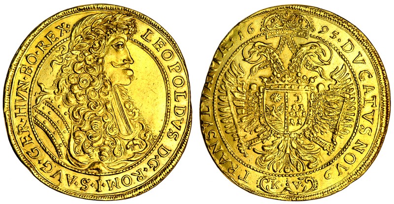 (x) Transylvania, Leopold I (1690-1705), Klausenburg, 10-Ducats, 34.42g, 1695, leopoldvs d.g. rom.i.s. avg. ger. hvn. bo. rex., laureate, draped and cuirassed bust right, rev. dvcatvs nov, transvlvania, shield of Transylvania on Imperial eagle, k:v for Kolos Var (Klausenburg) below (AHL.194; F.482; H.836; KM.517; Resch 13), edge slightly pushed in at sides, extremely fine, very rare