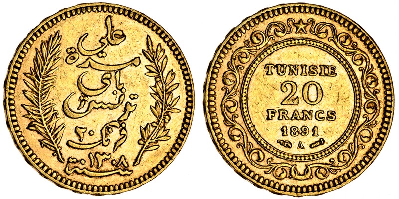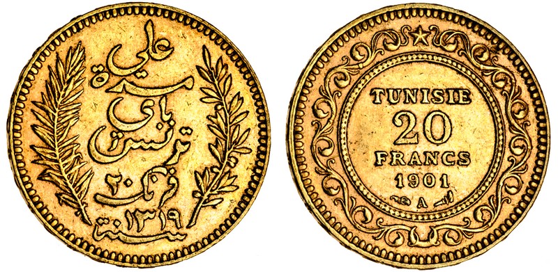 (g) Tunisia, 20-Francs (2), 1891, 1901, Arabic legend, rev. value and date in wreath (F.12), good very fine (2)