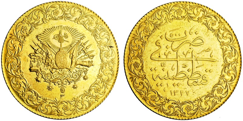 (g) Turkey, Mohammed V (1909-18), 'de luxe' 500-Piastres, 35.02g, year 3, Toughra above trophy of arms in ornamental border, rev. inscription in ornamental border (F.64; KM.842), extremely fine