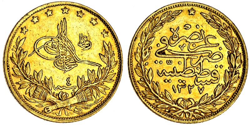 (g) Turkey, Mohammed V (1909-18), 100-Piastres, year 3 (F.52; KM.754), good very fine