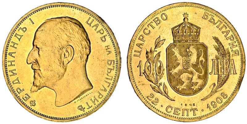 (g) Bulgaria, Ferdinand (1887-1918), 100-Leva, 32.28g, 1912, head left, rev. crowned shield dividing value (F.5; KM.34), some light surface marks otherwise extremely fine