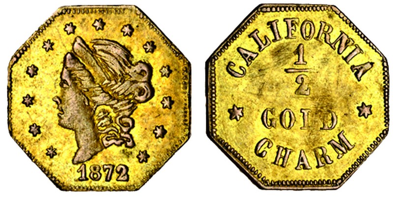 (x) United States of America, California octagonal gold charm, 1872, Liberty head left, thirteen stars around, rev. 1/2 in centre, california above, *gold*charm below
