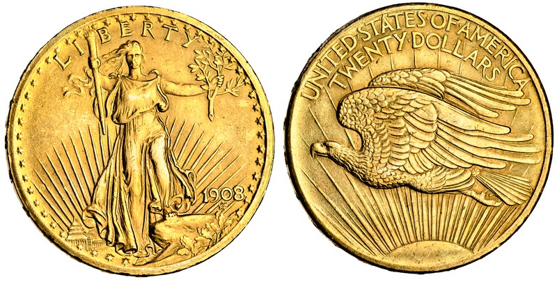 (g) United States of America, 20-Dollars, 1908, Liberty head left, rev. eagle, very fine