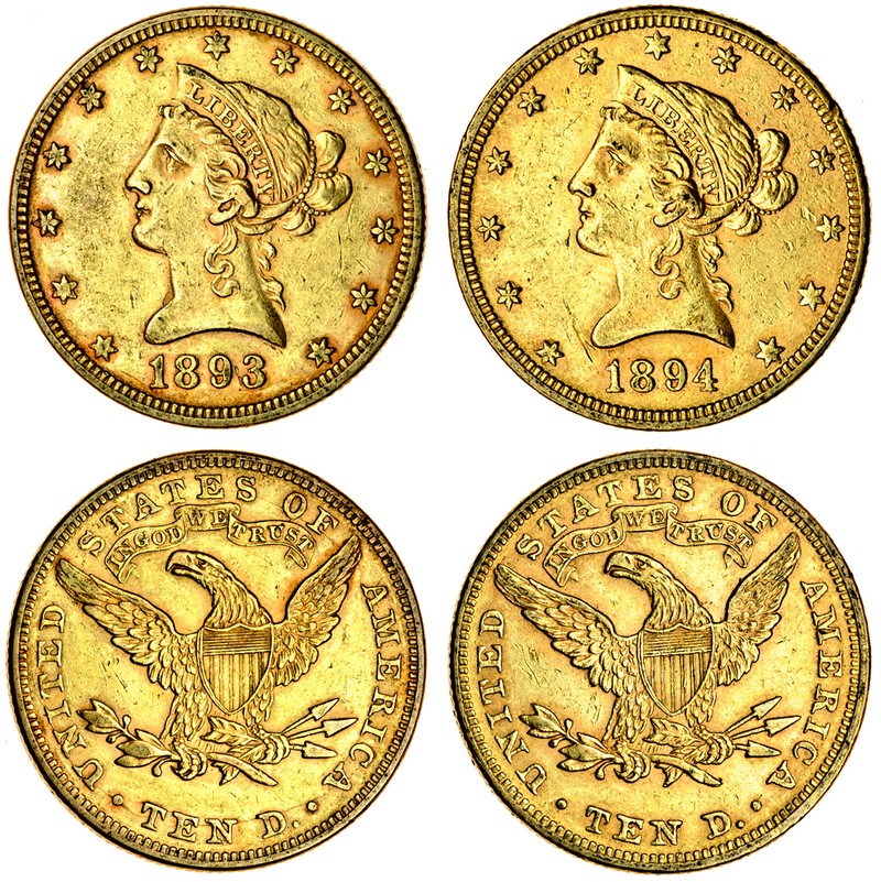 (g) United States of America, 10-Dollars (2), 1893, 1894, Liberty head left, rev. eagle, very fine (2)