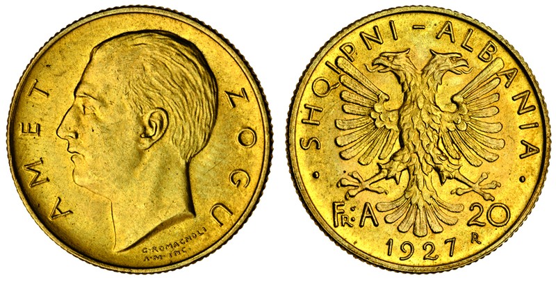 (g) Albania, Zog (president 1925, king 1928-39), Rome, 20-Franga Ari, 1927 R, head left, rev. double headed eagle (F.2; KM.10), extremely fine